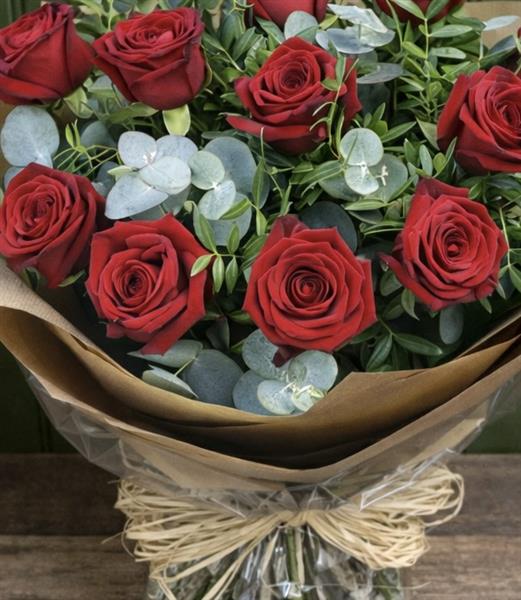 12 Beautiful red roses expertly hand tied and complimented with seasonal foliage's. The perfect Valentines Gift