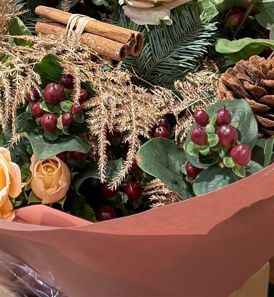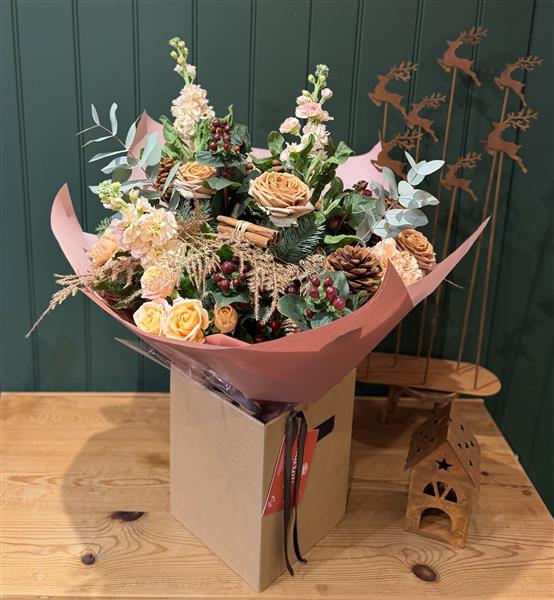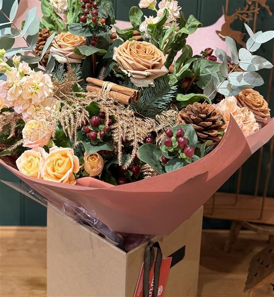 Accents of red berries, pinecones, and cinnamon sticks give the bouquet a cosy holiday feel, perfect for winter gifting or festive décor. The flowers are wrapped in complementary peach-toned paper and presented in a stylish kraft box for a refined, ready-to-display finish.
