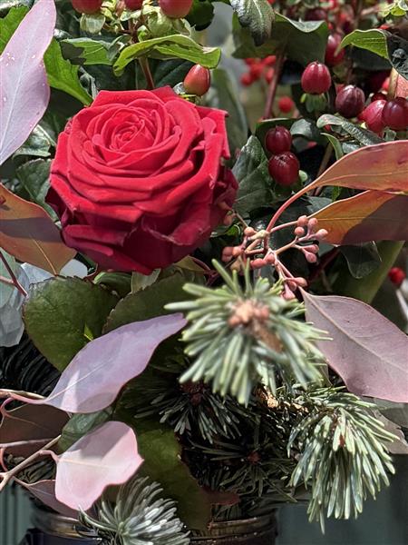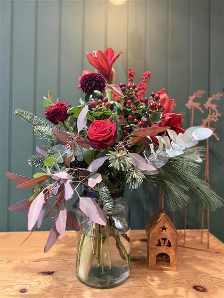 Celebrate the warmth of the season with our Crimson Winter Bouquet, a rich and festive blend of deep red blooms and winter greenery. This arrangement features vibrant roses, bold amaryllis, and seasonal berries, paired with lush pine, eucalyptus, and textural foliage for a natural woodland feel all arranged and delivered in Elegant Glass Vase.