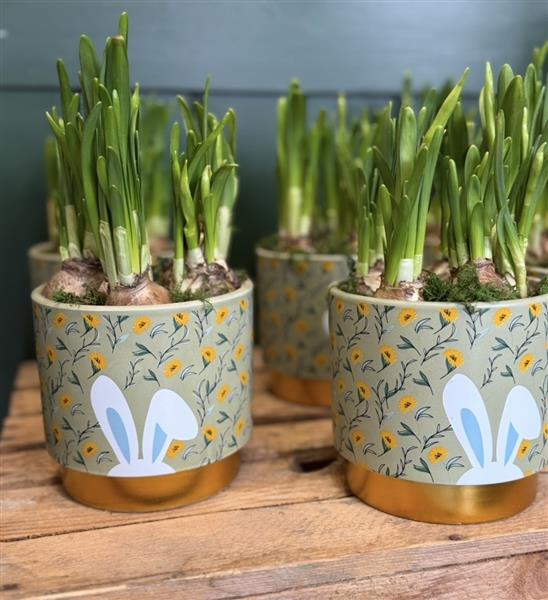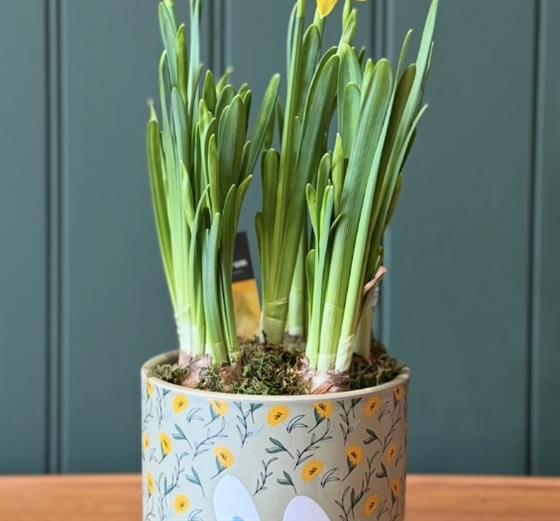 A easter inspired pot with a beautiful yellow narcissi plant, perfect for a small easter gesture.