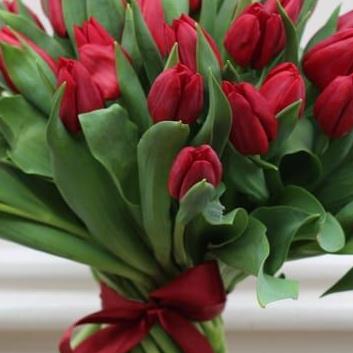 A compact hand-tied of Stunning Tulips and delicate foliage.