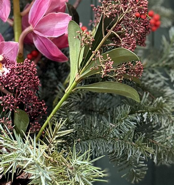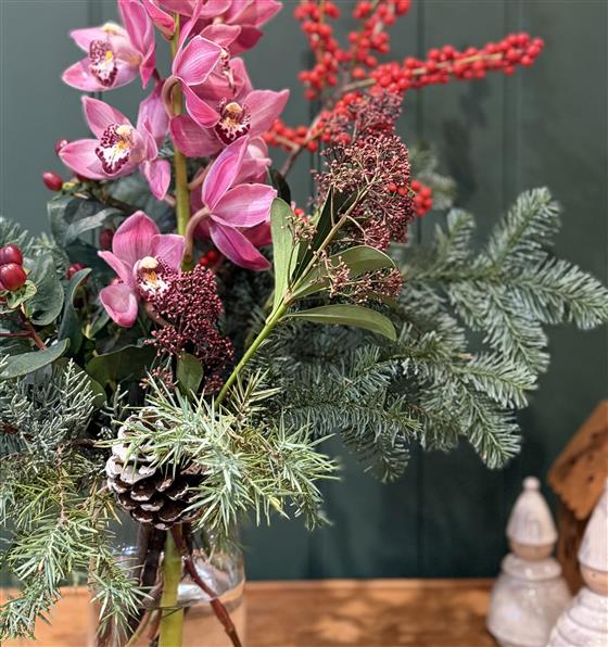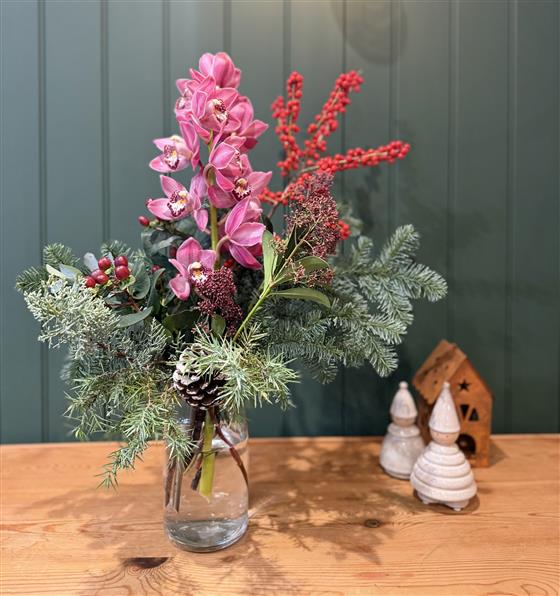 This elegant winter floral arrangement combines the lush beauty of pink cymbidium orchids with festive red berries and rich evergreen foliage. Arranged in a simple clear glass vase, it features a mix of seasonal greenery, including fir branches and textured conifer sprigs, accented by a natural pinecone for a woodland touch. Bright red hypericum and berry stems add cheerful pops of colour, while the tall orchid blooms bring sophistication and height to the design.